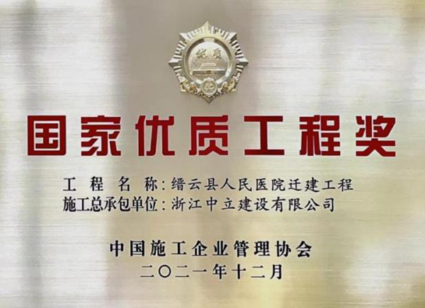 我公司承建的縉云縣人民醫(yī)院遷建工程榮獲2020—2021年度國家優(yōu)質(zhì)工程獎。這是中立獲得的第一個國家優(yōu)質(zhì)工程獎項目,也是麗水本地企業(yè)第一個獲國家優(yōu)質(zhì)工程獎項目。