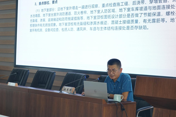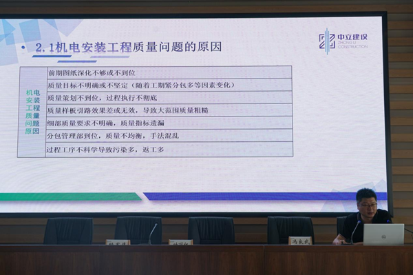 此次研討會由葉麗紅主持,技術部經理賴軍偉通過PPT展示了主體結構關注部位及核查依據,并對防水工程、混凝土工程、砌體及二次結構、屋面工程中常見質量通病進行講述。安裝總工馮良武分享了機電安裝工程的通病問題以及創(chuàng)優(yōu)策劃與實施。