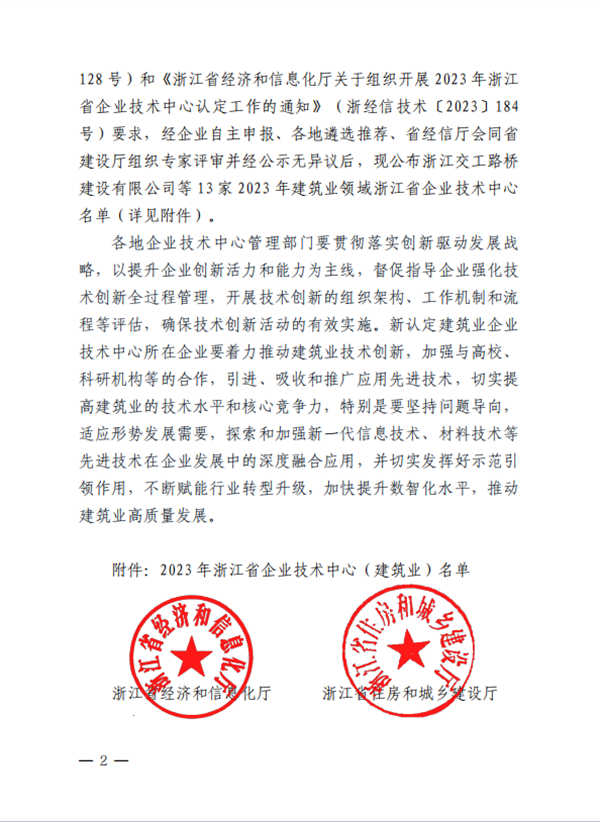 近日,浙江省經(jīng)濟(jì)和信息化廳等五部門(mén)公布2023年建筑業(yè)領(lǐng)域浙江省企業(yè)技術(shù)中心名單的通知,我公司企業(yè)技術(shù)中心榮獲2023 年建筑業(yè)領(lǐng)域浙江省企業(yè)技術(shù)中心認(rèn)定。