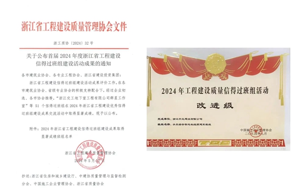 在2024年度工程建設(shè)質(zhì)量信得過(guò)班組比賽中,我公司水東樞紐項(xiàng)目團(tuán)隊(duì)獲得浙江省建設(shè)成果取得顯著成績(jī)班組和中國(guó)施工企業(yè)管理協(xié)會(huì)《2024年度工程建設(shè)質(zhì)量信得過(guò)班組改進(jìn)級(jí)》。