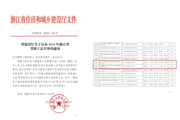 在2024年浙江省省級(jí)工法評(píng)選中,“富水軟土地質(zhì)條件下灌注樁高效接樁施工工法”與“基于BIM技術(shù)復(fù)雜大曲面GRC安裝施工工法”2項(xiàng)工法榮獲浙江省省級(jí)工法。