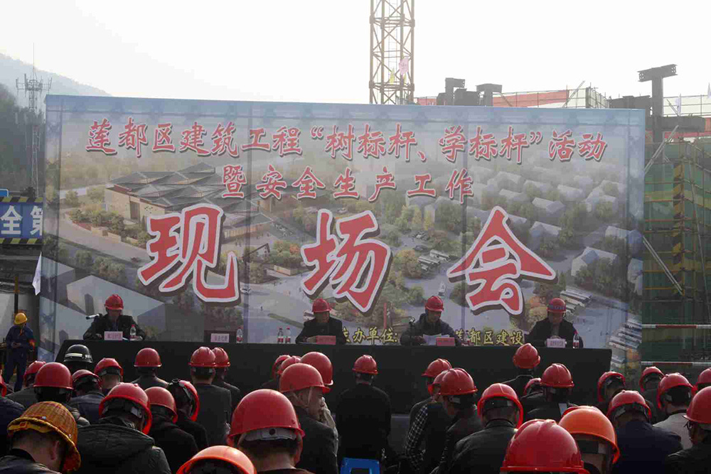 3月8日,蓮都區(qū)首次建筑工程“樹標(biāo)桿,學(xué)標(biāo)桿”活動(dòng)暨安全生產(chǎn)工作現(xiàn)場(chǎng)會(huì),在麗水市中立建筑工程有限公司承建的古堰畫鄉(xiāng)游客接待中心工程施工現(xiàn)場(chǎng)召開。參加會(huì)議的有蓮都區(qū)屬建筑施工企業(yè)分管安全生產(chǎn)負(fù)責(zé)人、在建建筑工程項(xiàng)目負(fù)責(zé)人,碧湖、大港頭、老竹三個(gè)中心鎮(zhèn)分管領(lǐng)導(dǎo)及安全管理人員,各建設(shè)管理所主要責(zé)任人和安全管理人員,執(zhí)法大隊(duì)負(fù)責(zé)建筑工程施工安全生產(chǎn)管理人員,建設(shè)房產(chǎn)科相關(guān)人員,共計(jì)100余人。