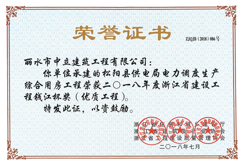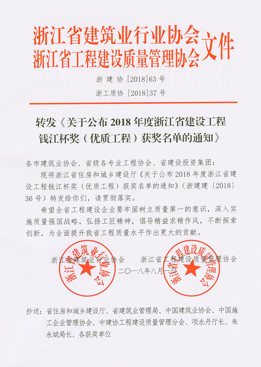喜報!近日,省建設(shè)廳頒發(fā)了2018年度浙江省建設(shè)工程“錢江杯”(優(yōu)質(zhì)工程)文件,我公司“麗水市體育館體育中心工程、松陽縣供電局電力調(diào)度生產(chǎn)綜合用房工程”分別獲得2018年度“錢江杯”(優(yōu)質(zhì)工程)獎。